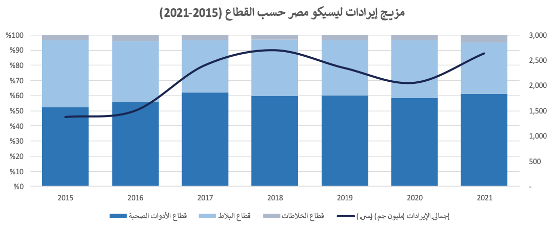 يوضح الرسم البياني هيكل الإيرادات الثابت لشركة ليسيكو مصر[LCSW] بقيادة قطاع الأدوات الصحية. نلاحظ أن جميع القطاعات الثلاثة لم تتغير إلى حد كبير بمرور الوقت على الرغم من تقلب الإيرادات بمعدل نمو سنوي مركب لمدة 6 سنوات (2015-2021) قدره 12%. يوضح الرسم البياني ارتفاع الإيرادات بعد تعويم الجنيه في أواخر نوفمبر 2016 وتراجع الإيرادات مع ظهور جائحة كوفيد-19 في أوائل 2020 قبل أن تبدأ الإيرادات في التعافي في 2021.