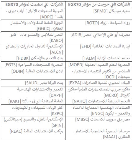 تم أمس إعادة توازن مؤشر EGX30 النصف سنوي، مع خروج أسهم شركة الإسكندرية لتداول الحاويات والبضائع [ALCN]، وبنك الإسكان والتعمير [HDBK]، وبنك قطر الوطني الأهلي [QNBA] من المؤشر واستبدالها بأسهم إيديتا للصناعات الغذائية [EFID]، تعليم لخدمات الإدارة [TALM]، ومصرف أبو ظبي الإسلامي – مصر [ADIB]. أما بالنسبة لمؤشر EGX70 فقد تم استبدال 13 سهم. ستكون المؤشرات المعاد توازنها سارية اعتباراً من جلسة تداول 1 فبراير 2023. (البورصة المصرية)