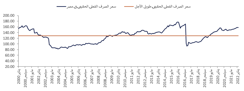 قبل 21 مارس، كان سعر الصرف الفعلي الحقيقي في مصر قد وصل إلى أعلى مستوى له منذ تخفيض قيمة العملة في 2016، حيث ارتفع بمقدار 6% على أساس سنوي هذا العام حتى الآن. يشير هذا الانحراف الكبير في سعر الصرف الفعلي الحقيقي عن المستويات طويلة الأجل، متزامناً مع الأساسيات الضعيفة المتعلقة باستمرارية عجز الحساب الجاري ونقص تراكم صافي الأصول الأجنبية بعد جائحة كوفيد-19، إلى أن العملة كانت أعلى من قيمتها.