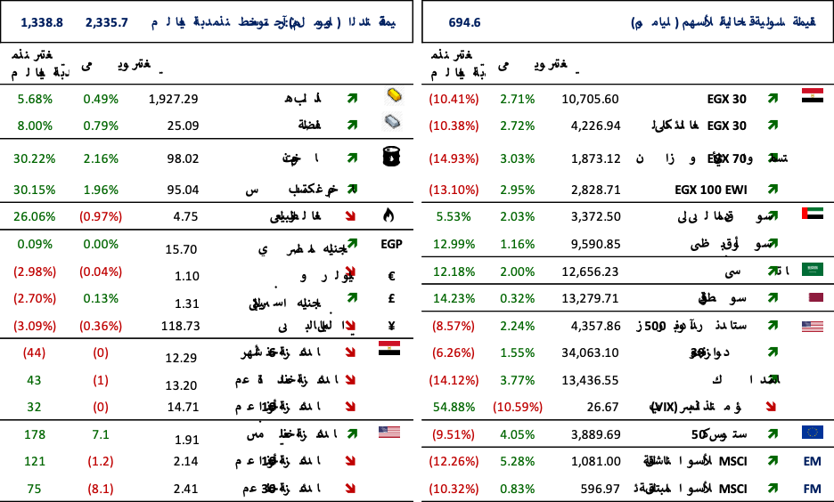 هنا في مصر، استجاب السوق بالمثل أمس، حيث شهد مؤشر EGX 30 تحقيق مكاسب ملحوظة. وقد شهدت غالبية الأسهم الكبرى تعافياً أمس، حيث بدأت موجات الذعر الناجمة عن المخاطر العالمية في فقد بعض الزخم. غير أنه من المثير جداً للاهتمام أن نرى الأجانب كصافي بائعين إلى حد كبير في جلسة الأمس، في مقابل أنشطة الشراء الضخمة من المؤسسات المحلية.