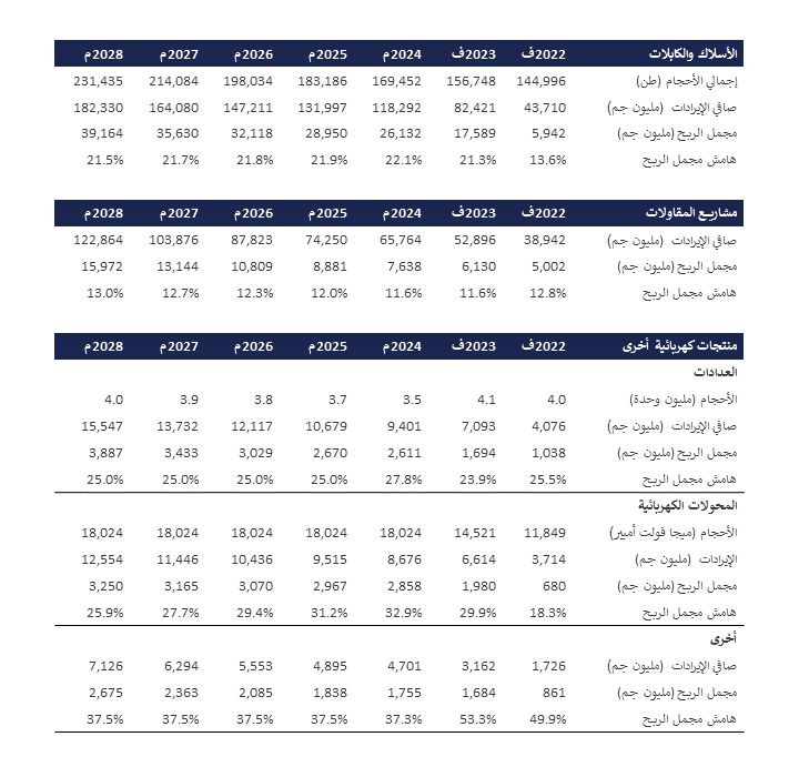 نتوقع أن تستمر الإيرادات في النمو بمعدل مرتفع مكون من رقمين خلال فترة توقعاتنا حتى 2028، مدفوعةً بزيادة أحجام مبيعات قطاع الأسلاك والكابلات، وتحسُن التسعير، والنمو في مشاريع البنية التحتية المحلية والعالمية.