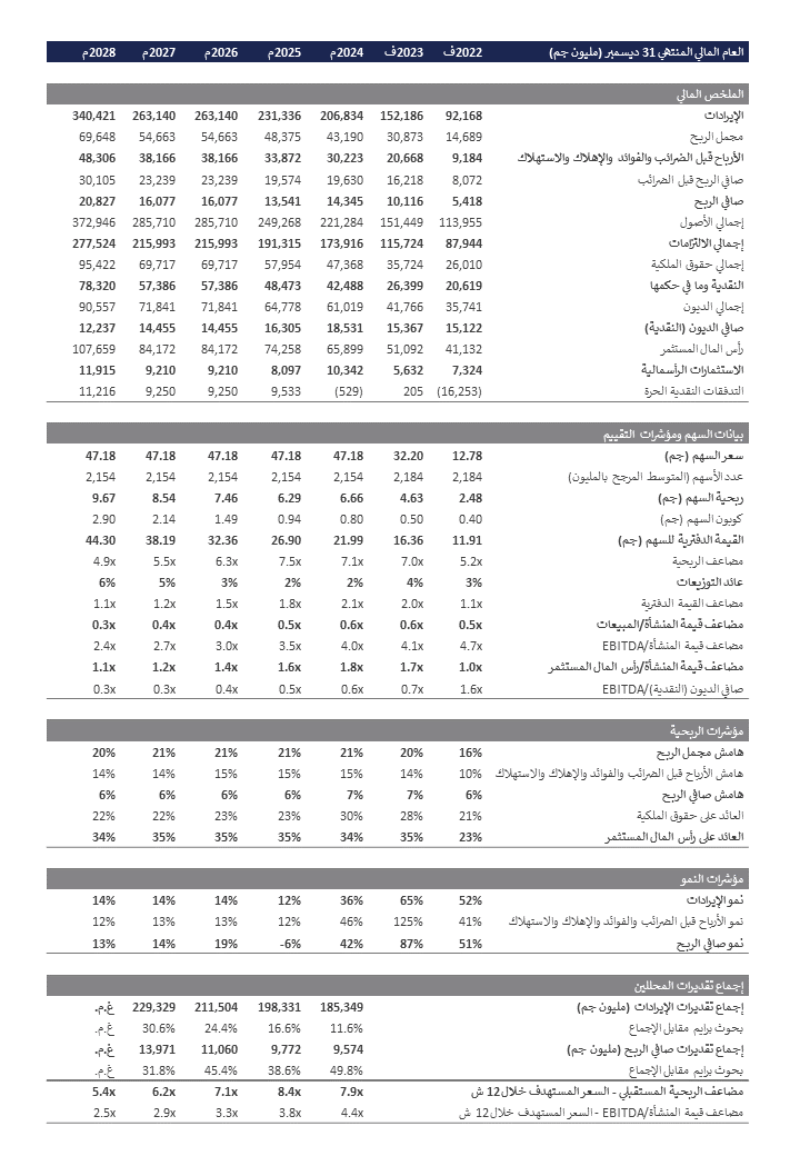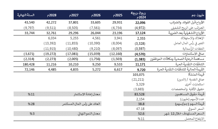 أنتج نموذج التدفقات النقدية المخصومة لخمس سنوات المحدث قيمة عادلة قدرها 38.8 جنيه/سهم وسعر مستهدف خلال 12 شهر عند 52.6 جنيه/ سهم (ارتفاعاً من 36.2 جنيه/سهم)، أي أعلى بنسبة 7% فقط عن سعر عرض الاستحواذ البالغ 1.05 دولار (ما يعادل 49.3 جنيه/سهم) وبارتفاع محتمل يبلغ 11% عن سعر السوق الحالي.