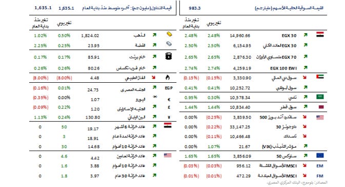 مع قيام الأسواق العالمية والإقليمية بإعادة ضبط العدادات إلى الصفر، كان يوم التداول الأول من العام الجديد في مصر يوماً مُبشراً. وقفز مؤشرا السوق الرئيسيان بنسبة 2.5% في مؤشر EGX 30 و2.6% في حالة EGX 70 EWI. يشير هذا إلى أن المستثمرين قد يبدأون بداية جيدة، ولكن إلقاء نظرة فاحصة على صافي تداول أمس يشير إلى استمرار الاتجاه الأخير. فالمستثمرون الأجانب لا يزالون صافي بائعين، في حين كان المستثمرون المصريون والعرب صافي مشترين. المثير للاهتمام هو أن المؤسسات المصرية، التي نود أن نسميها الأموال الذكية، تشتري في السوق، وإن كانت تشكل أقل من ربع تداولات السوق. ومع ذلك، فهذه علامة جيدة نأمل أن تستمر مع تقدم العام.