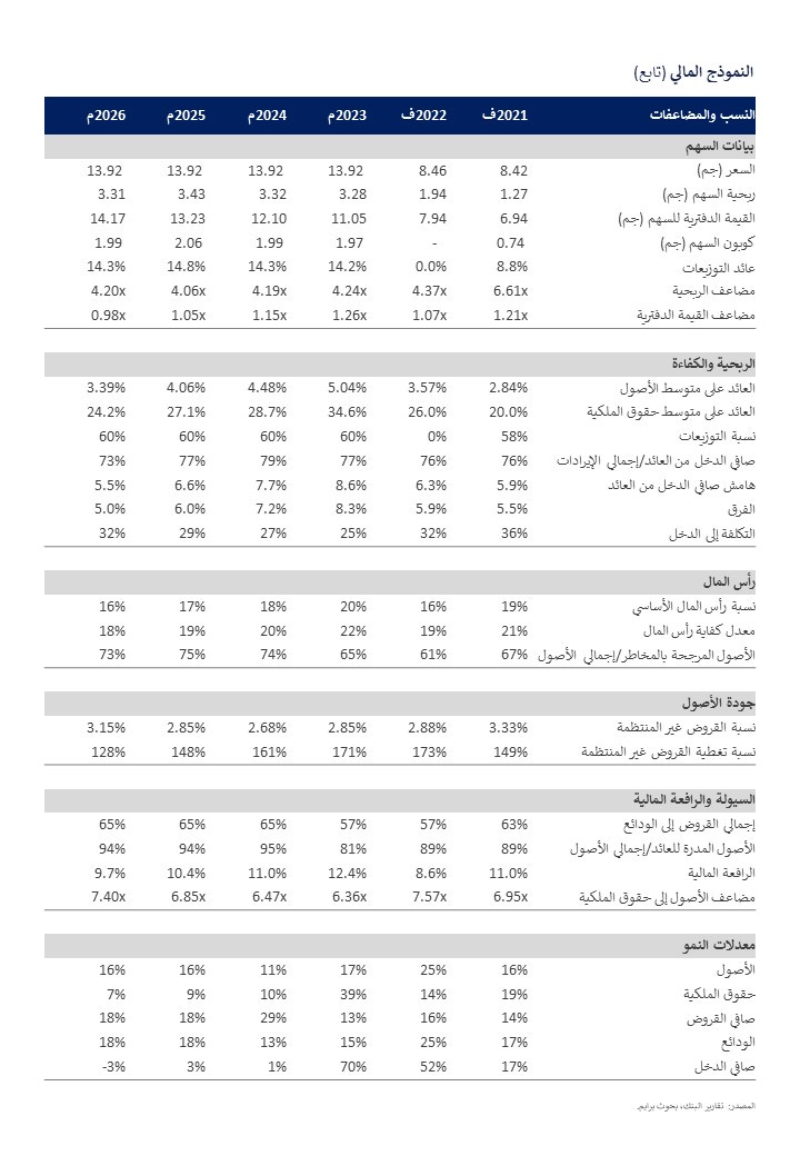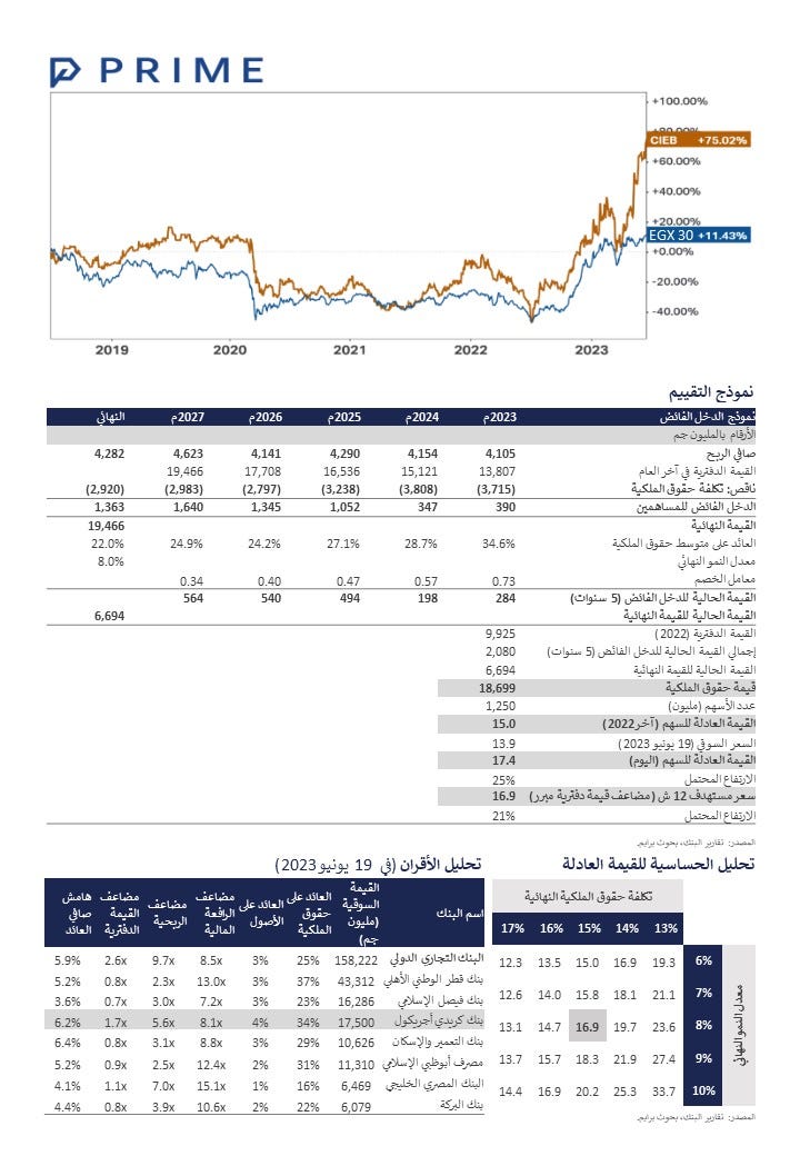 رفع السعر المستهدف خلال 12 شهر بنسبة 103% إلى 16.9 جم/سهم، ومع ذلك تخفيض التصنيف إلى محايد / مخاطرة متوسطة: تم حساب القيمة العادلة بناءً على نموذج الدخل الفائض عند 17.3 جم/سهم، بافتراض عائد على حقوق الملكية طويل الأجل يبلغ 21% وتكلفة حقوق الملكية طويلة الأجل تبلغ 15%. ومع ذلك، قمنا بتحديد السعر المستهدف خلال 12 شهراً عند16.9 جم/سهم بناءً على مضاعف قيمة دفترية مبرر مساوٍ لـ 2 ضعف حقوق الملكية بالربع الأول 2023. ويعطي ذلك احتمالاً للصعود بنسبة22%، والتي لا تزال أقل من تكلفة حقوق الملكية للبنك. وبالتالي، فإننا نخفض التصنيف من زيادة الوزن النسبي إلى محايد مع الاحتفاظ بنفس المخاطرة المتوسطة. يشير السعر المستهدف الجديد إلى مضاعف قيمة دفترية ضمني لـ 2023 يبلغ 1.5 مرة. المحفزات الرئيسية: تخفيض آخر لقيمة الجنيه المصري سيساعد على نمو محفظة القروض لدى البنك. نمو الأرباح بمعدل أعلى من المتوقع. المخاطر الرئيسية: اشتداد المنافسة. تدهور جودة الأصول مما يؤدي إلى زيادة تكلفة المخاطر أعلى من المتوقع.