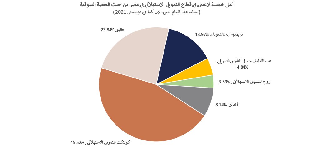 بلغ سوق التمويل الاستهلاكي في مصر 9.7 مليار جم بنهاية ديسمبر 2021. كونتكت للتمويل الاستهلاكي، التابعة لشركة كونتكت المالية القابضة [CNFN]، لا تزال في الصدارة بأعلى حصة سوقية قدرها 45.52%، تليها فاليو، التابعة للمجموعة المالية هيرميس القابضة [HRHO]، بحصة سوقية تبلغ 23.84%. وفي الوقت نفسه، احتلت شركة رواج للتمويل الاستهلاكي، التابعة لشركة ارابيا إنفستمنتس هولدنج [AIH]، المرتبة الخامسة بحصة سوقية بلغت 3.69%.