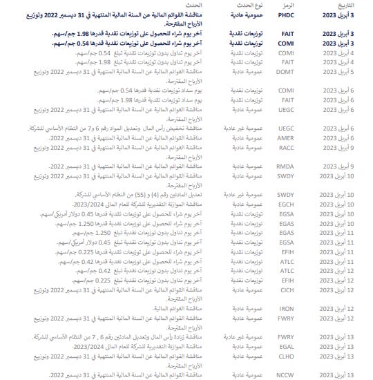 وافقت الجمعية العامة غير العادية لـإيبيكو [PHAR] على زيادة رأس مال الشركة بمبلغ 496 مليون جم (+50%) عن طريق طرح 49,585,250 سهم جديد بالقيمة الاسمية البالغة 10 جم/سهم بدون أي علاوة إصدار. بالإضافة إلى ذلك، وافقت الجمعية العامة العادية لـ PHAR على توزيع أرباح نقدية بقيمة 2.0 جم/سهم ويتم توزيعها على قسطين متساويين، في أبريل وأغسطس 2023. (إفصاح الشركة)
