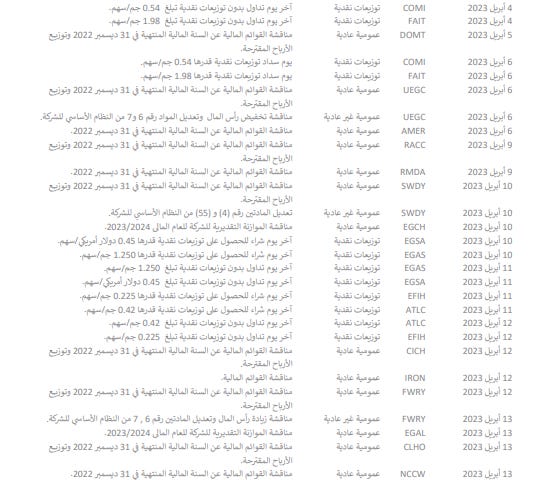 وافقت الجمعية العامة العادية للنساجون الشرقيون للسجاد [ORWE] على توزيع أرباح نقدية بقيمة 0.60 جم/سهم في مايو 2023، مما يعني عائد بنسبة 4%. (إفصاح الشركة)