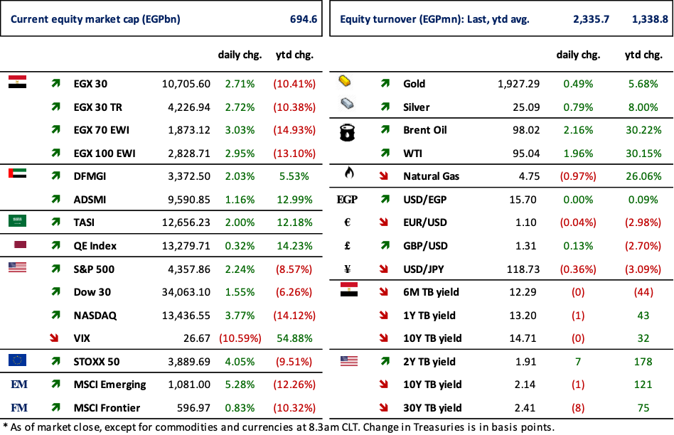 Global equities went through a synchronized pickup post the Fed’s decision to hike interest rates for the first time since the year 2018. U.S. equity indices bounced back after briefly trading in the red territory yesterday, with indices gaining between 1.5% and 3.7%. U.S. Fed Chair signaled the massive uncertainty the economy faces from the war between Russia and Ukraine and the ongoing COVID-19 crisis, yet he said "ongoing increases" in the target federal funds rate "will be appropriate" to curb the highest inflation the country has witnessed in 40 years. Asian shares rose in response to the overall sentiment improvement for risk assets, as peace talks between Russia and Ukraine haven’t failed yet. Moreover, the promise of more economic stimulus from China has calmed investors’ worries regarding a slowdown in China. On the other hand, Brent oil prices slipped below the USD100/bbl mark, as ongoing peace talks between Russia and Ukraine have relatively soothed supply tightness fears, given the growing possibility of the returning Iranian output to the market.