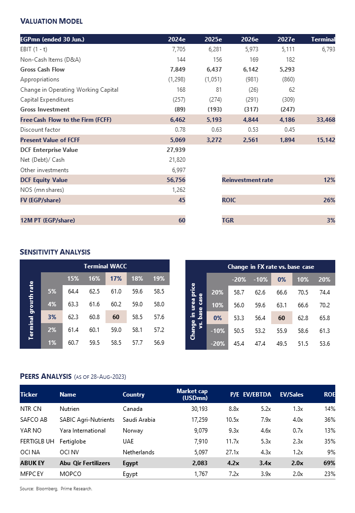 12MPT raised to EGP60/share, with our Neutral / Medium Risk rating maintained: After reviewing these assumptions and penciling them into the company's financial model, using a discounted cash flow model, assuming a WACC of 17% and a long-term growth rate of 3%, we raise our 12-month price target by 14% to EGP60/share from EGP52.8/share, while maintaining our Neutral / Medium Risk rating, with an 18% upside potential. Notably, our valuation depends heavily on natural gas costs as well as urea prices and FX rate fluctuations. Our new 12MPT implies a 6x P/E ratio and a 2.8x EV/EBITDA ratio for FY2023/24.