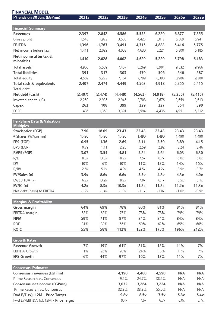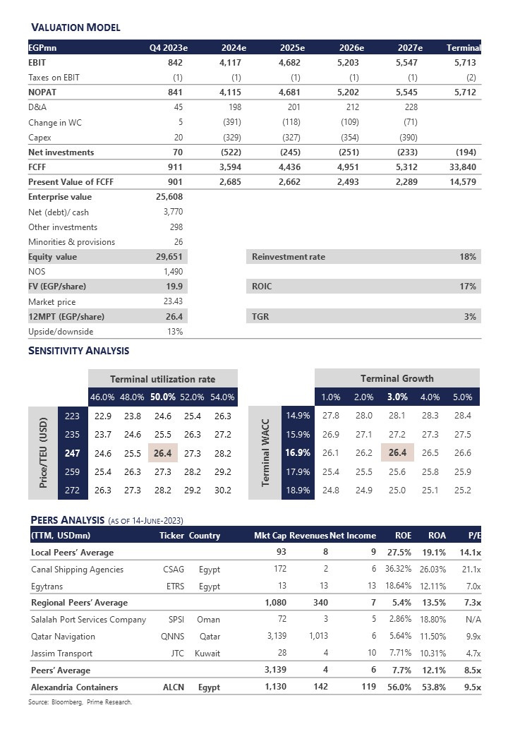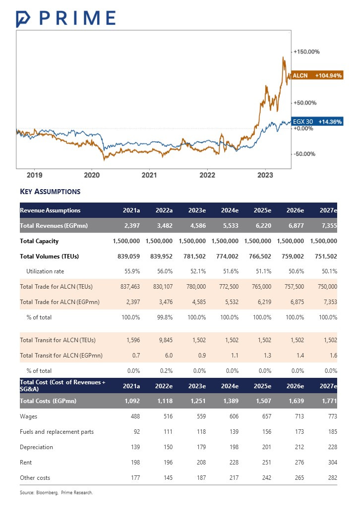 12MPT raised slightly, downgraded to N/M, and removed from SPP: Our updated 5y DCF model yielded a fair value of EGP19.9/share and a 12MPT of EGP26.4/share, implying a 2023/24e P/E of 8.5x and suggesting an upside potential of 13%. Thus, we downgrade our rating from Overweight / Medium Risk to Neutral / Medium Risk. As a result, we remove ALCN from our STANDPoint Portfolio (SPP). Key Catalysts: Further EGP devaluation. Government’s trade support programs. Higher EGP interest rates. Key Risks: New competition from EGMPT in Alexandria Port. Investors’ focus shifting to upcoming IPOs in the sector (i.e. DCCC and POCO). A stronger EGP.