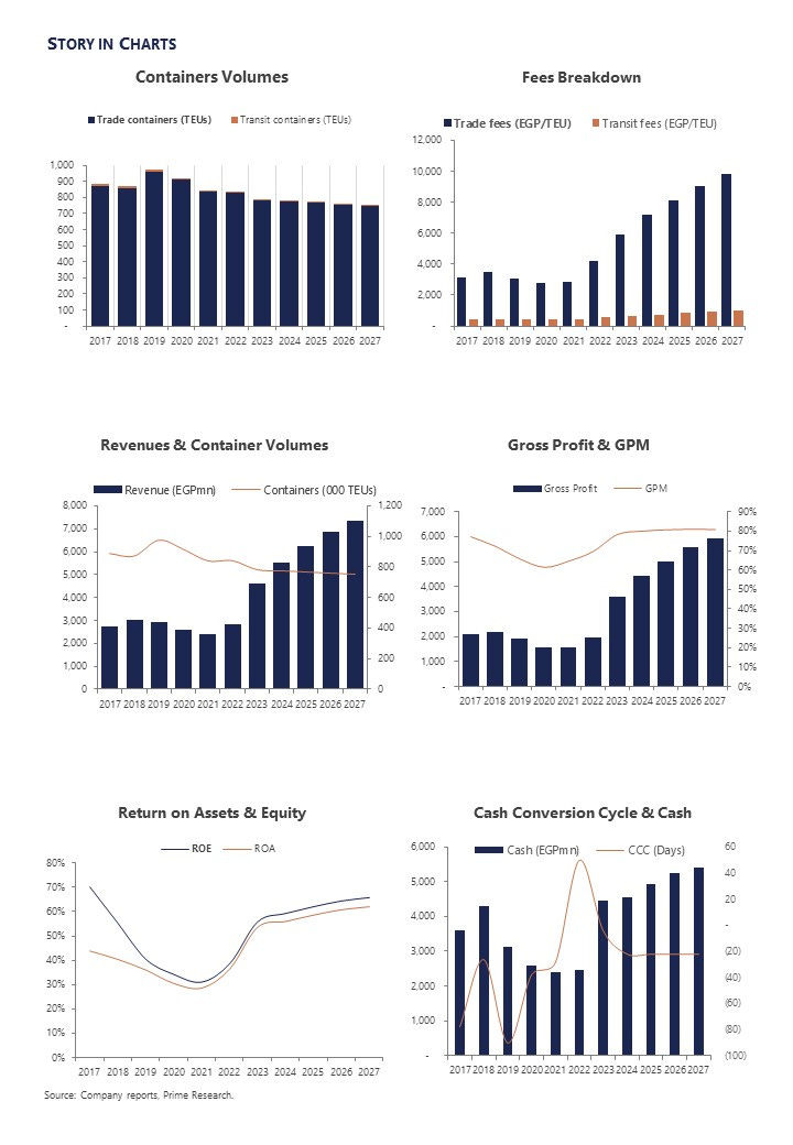 Unrivaled fundamentals: ALCN boasts unrivaled characteristics, namely a negative cash conversion cycle, a debt-free and cash-heavy balance sheet, a regular and generous dividend payout, very high margins and ROEs, and—most notably—USD-linked revenues. Currently, the only peers close to ALCN are Damietta Containers Handling Co. [DCCC] and Port Said Containers Handling Co. [POCO]. Both companies, listed on the EGX but are yet to trade, have lower revenues and margins compared to ALCN’s. We consider ALCN to be a good choice for value and income-based investors and as a hedge against local currency fluctuations.