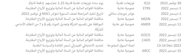 عينت شركة مصر للألومنيوم [EGAL] شركة بريميير كمستشار مالي مستقل لإعداد دراسة القيمة العادلة قبل الاستحواذ المحتمل من خلال زيادة رأس المال من قبل صندوق الاستثمارات العامة. (البورصة)مساهمو القناة للتوكيلات الملاحية يوافقون على توزيع أرباح نقدية وتعيين رئيس جديد لمجلس الإدارة