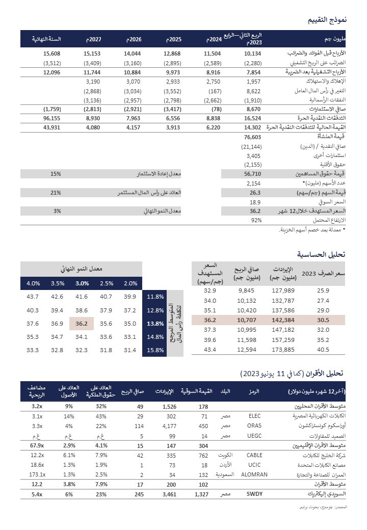 على الرغم من تباطؤ أسعار السلع العالمية خلال الأشهر القليلة الماضية، فقد نمت إيرادات السويدي إليكتريك بسبب ارتفاع الدولار الأمريكي، مدفوعةً بنموذج أعمالها الموجه للتصدير. في الوقت نفسه، فقد زاد تعرض قطاع مشاريع المقاولات في السويدي إليكتريك إلى أسواق جديدة، مثل دول مجلس التعاون الخليجي، مما عزز أداء السويدي إليكتريك بشكل أكبر. في الربع الأول 2023، ارتفعت إيرادات الشركة واتسعت الهوامش في نفس الوقت بسبب إدارتها الحكيمة للمخزون جنباً إلى جنب مع ارتفاع أسعار البيع بسبب ارتفاع سعر الصرف. اليوم، نؤكد وجهة نظرنا الإيجابية عن الشركة وسهمها بتصنيف زيادة الوزن بعد رفع السعر المستهدف خلال 12 شهر بنسبة 91% إلى 36.2 جم/سهم. يتم تداول سهم السويدي إليكتريك حالياً بمضاعفات جذابة على مضاعف ربحية ومضاعف قيمة المنشأة إلى EBITDA لآخر 12 شهر عند 5.4 مرة و4.7 مرة، على التوالي، ونسبة مضاعف ربحية إلى النمو لمدة خمسة أعوام قادمة منخفضة بشكل غير عادي تبلغ 0.3.