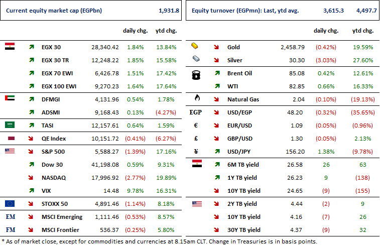 The government's budget deficit in FY24 came lower than expected at EGP505bn (-17% y/y), we note that the expectation was EGP555bn. Meanwhile, the primary surplus grew enormously to EGP857bn vs. only EGP164bn last year and the government's revenues grew by 59% y/y. The government's spending grew by 37% y/y, where education spending came 11% higher than expected at EGP256bn and health spending came 22% higher than expected at EGP180bn. (Enterprise)
