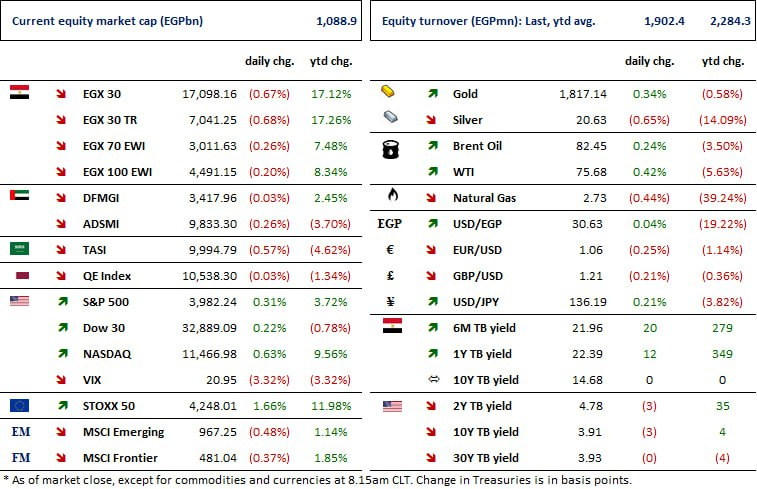 Oriental Weavers Carpet [ORWE] reported Q4 2022 consolidated net profits of EGP316mn (+39% y/y) on higher revenues of EGP3.8bn (+25% y/y). Revenue growth was driven by prices rather than volumes which decreased 20% y/y to 28.1mn sqm. Still, the Egypt-based woven segment was the highest revenue contributor with 65% or EGP2.5bn (+35% y/y). However, gross profit and EBITDA margins decreased to 7% (-7pp y/y) and 11% (3pp y/y), respectively. The BoD proposed distributing a cash dividend of EGP0.6/share, implying a 5% yield. (Company disclosure)