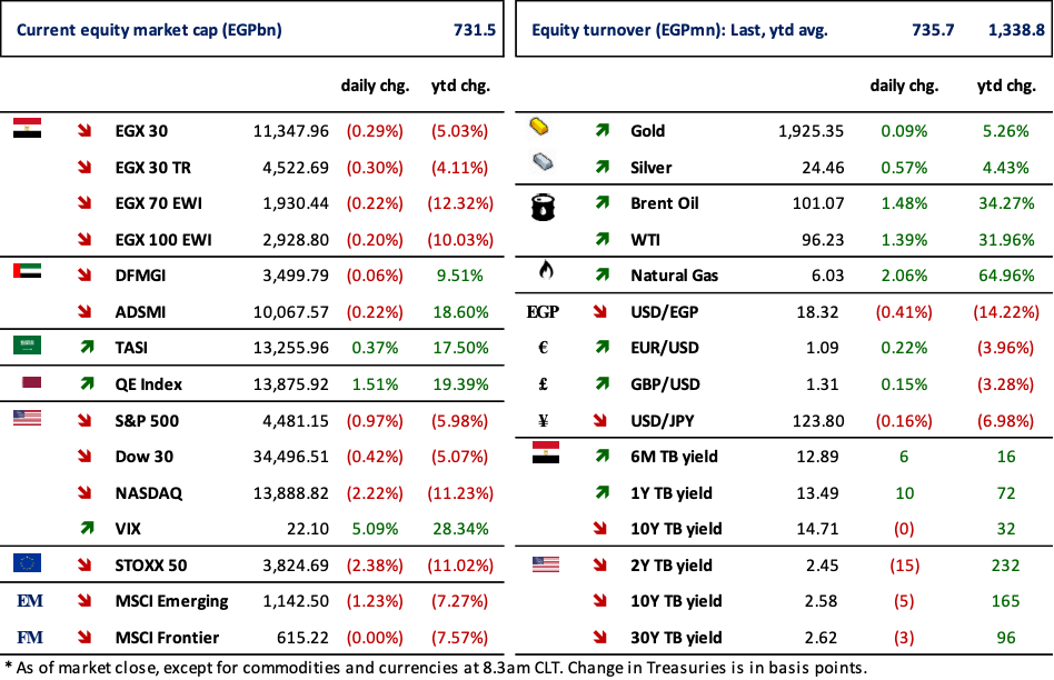 Here at home, we continue to see M&A playing out as the main outstanding theme of the five themes we had mentioned in our STANDPoint strategy note published on 30 January 2022. Trading in the market has become transaction based. For instance, a potential bid for EFG-Hermes Holding [HRHO] drove the stock price higher. Another example is Domty [DOMT] which saw its price rise as a result of another bid. A third example is B Investments’ [BINV] exit from Giza Systems, cashing out on one of its private equity investments. Thus, we think Egypt stocks’ performance will continue to be event-driven for the rest of H1 2022, be it M&A or share buybacks.