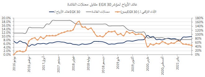 على مدى السنوات الخمس الماضية، بلغ متوسط مضاعف الربحية الأسبوعي لمؤشر EGX 30 حوالي 15 مرة، بينما يبلغ الآن نحو 10 مرات. بالإضافة إلى ذلك، إذا عكسنا مضاعف الربحية للمؤشر، فسنحصل على ما يسمى عائد الأرباح. في الوقت الحالي، بلغ عائد الأرباح للمؤشر 10% (مقابل متوسط 5 سنوات بلغ 7%). علاوة على ذلك، فإن مقارنة عائد الأرباح لمؤشر EGX 30 بأسعار الفائدة الرئيسية يعطينا رسماً بيانياً مثيراً للاهتمام. كان تعويم الجنيه في نوفمبر 2016 بمثابة تغيير كبير في قواعد اللعبة، حيث دفع أسعار الفائدة الرئيسية إلى مستويات مرتفعة. وعلى الرغم من ذلك، فإن عائد الأرباح لمؤشر EGX 30 على مدى السنوات الخمس الماضية لم يتجاوز أبداً معدلات الفائدة الرئيسية بسبب بيئة أسعار الفائدة المرتفعة، كل ذلك حتى عام 2020 عندما تأثر كلا المتغيرين بجائحة كوفيد-19. في حين انخفضت أسعار الفائدة، وهو ما يعكس بشكل خاص إجراءات التيسير التي يتخذها البنك المركزي، بدأ عائد الأرباح للمؤشر في مطابقة أسعار الفائدة الرئيسية وحتى تجاوزها. مع اتساع الفارق بين المتغيرين، نعتقد أن هذا يعكس نوعاً ما الكيفية التي أصبحت بها الأسهم ذات القيمة السوقية الرخيصة مقارنة بعائد الأرباح للمؤشر لمدة 5 سنوات.