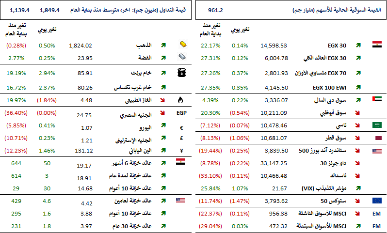 • أنهى مؤشر EGX 30 العام بارتفاع قدره 22.2%، متفوقاً على جميع الأسواق الإقليمية (الأفضل أداءً كان ADX + 20.3%) وكذلك الأسواق المتقدمة (الولايات المتحدة -19.4%) والناشئة (-22.4%) والأسواق المبتدئة (-29%). ومع ذلك، لا يزال مؤشر EGX 30 منخفضاً بنسبة 21% عن أعلى مستوى سجله عند 18,414.11 في أبريل 2018.