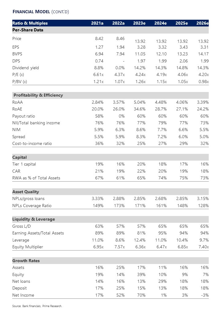 Solid credit quality: We expect credit quality to remain intact throughout 2023, where the cost of risk (CoR) to remain around -60bps (same as 2022) with an NPL ratio of 2.9% and a coverage ratio of 171%.