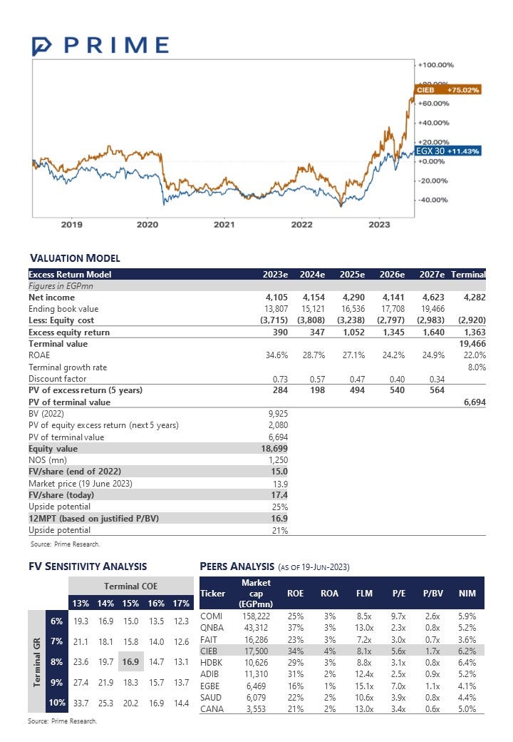 12MPT raised by 103% to EGP16.9/share, yet downgraded to Neutral / Medium Risk: Our residual income-based fair value came out as EGP17.3/share, assuming a long-term ROE of 22% and a terminal COE of 15%. However, we set our 12MPT at EGP16.9/share based on a justified P/BV of 2x applied to Q1 2023 equity. This offers an upside potential of 21%, which is still lower than CIEB’s COE. Hence, we downgrade our rating from Overweight to Neutral with the same Medium Risk. Our new 12MPT implies a 2023e P/BV of 1.5x. Key catalysts: Further EGP devaluation amplifying CIEB’s loan book. A higher-than-anticipated earnings growth. Key risks: Intensifying competition. Deterioration in asset quality resulting in a higher-than-expected CoR.
