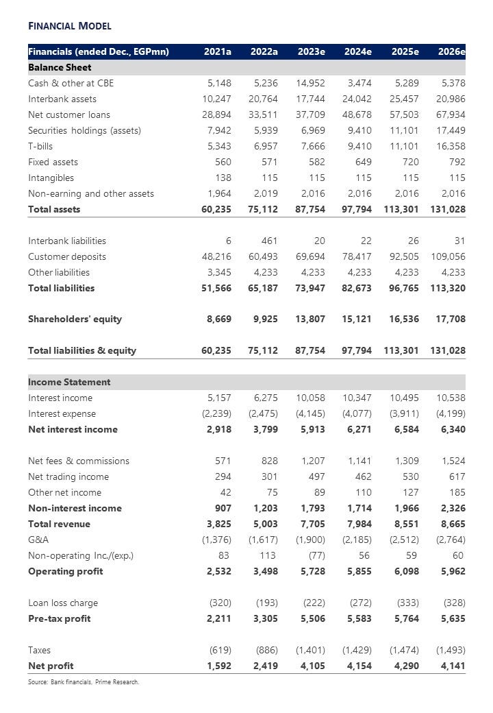 Strong earnings growth, driven by NII: We expect net income to grow 70% y/y to EGP4.1bn in 2023, given the expected 56% y/y growth in NII to EGP5.9bn in light of the cumulative effect of the interest rate hikes. We noticed a similar pattern in 2016 and 2017 when net income grew by 32% and 43%, respectively.