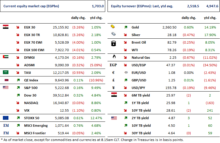 Commercial International Bank (CIB) [COMI] reported the standalone figures for Q1 2024 with 96% y/y increase in earnings to EGP12bn, thanks to 73% y/y increase in net interest income. ROAE increased from 37.5% in Q1 2023 to 50.2% in Q1 2024, while asset quality improved with NPLs to gross loans reaching 4.28% vs. 5.2% in Q1 2023. Results imply P/B of 2.2x. (Bank disclosure)