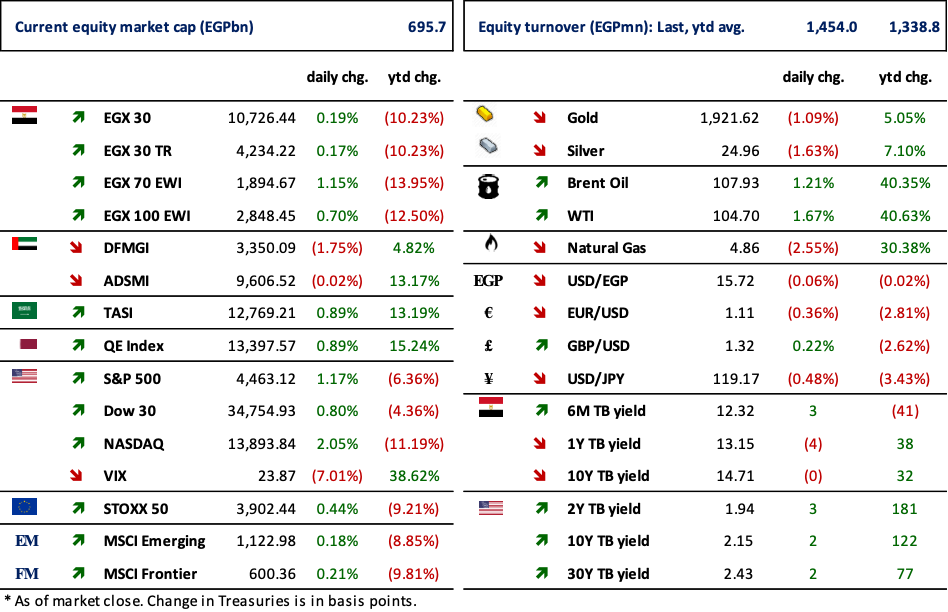 Inflation drivers continued to mount after the government hiked butane gas cylinder prices by 6.7%, reaching EGP75 for household cylinders and EGP150 for commercial consumption. Such inflationary pressure is predicted to be met with a tight monetary action by the CBE this week. We initially thought that we do not think the CBE will begin its tightening cycle with aggressive rate hikes, as uncertainty remains high, and a de-escalation of the conflict will have a significant impact on global commodity markets. However, this takes nothing from our predictions that at least interest rates will be hiked by 200-300bps in 2022, the first of which we think will occur at the March 24 meeting this week. As a reflection on the market, such policy response should favor companies with resilient balance sheets, while denting the profitability of high-leveraged names.