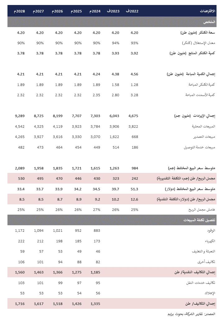 كان الربع الأول من عام 2024 استثنائياً بسبب التحول في المبيعات عن الربع الرابع من عام 2023، لذلك نتوقع عودة أحجام المبيعات إلى طبيعتها في الفترة المتبقية من العام. واجهت شركة ARCC، مثل غيرها من منتجي الأسمنت المصريين، فائضاً في العرض في السوق المحلية. كما أنها تشهد منافسة شرسة في أسواق التصدير، خاصة من تركيا والجزائر. وبالتالي، افترضنا أن معدلات استخدام الكلنكر وأحجام المبيعات ستستقر عند 90% و4.2 مليون طن سنوياً، على التوالي، حتى عام 2028. وفي الآونة الأخيرة، ركزت شركة ARCC على تصدير الكلنكر لتأمين التدفقات الدولارية. وتمثل الصادرات 40% من إنتاج الكلنكر في شركة ARCC في عام 2023، والذي نتوقع أن يرتفع إلى 50% مع نفس مزيج الكلنكر المحلي/التصدير مثل مستويات عام 2023.
