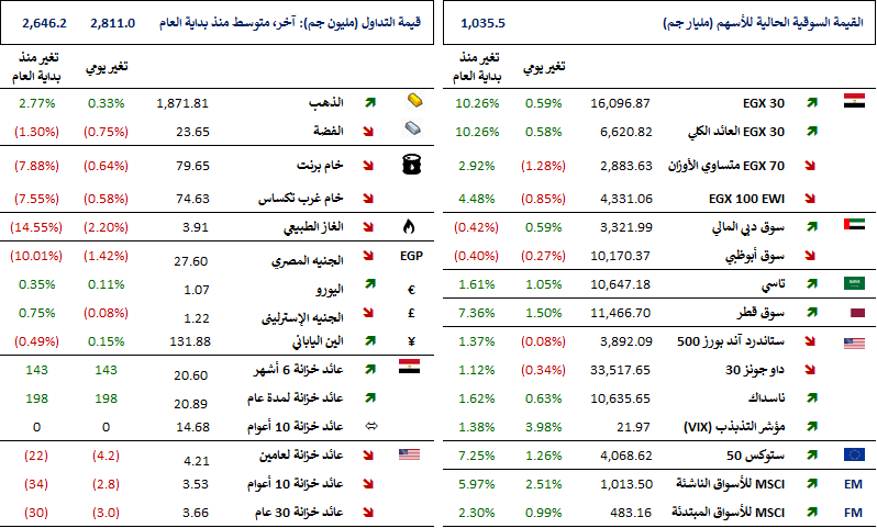 بعد أن ارتفع بما يصل إلى 1.7% خلال اليوم، تقلص مؤشر EGX 30 معظم مكاسبه ليغلق أمس مرتفعاً بنسبة 0.6% فقط، ولا يزال فوق مستوى الـ 16,000 نقطة. من ناحية أخرى، اتخذ مؤشر EGX 70 EWI اتجاهاً مماثلاً، حيث صعد بما يصل إلى 0.7% خلال اليوم قبل أن ينخفض، لينهي اليوم متراجعاً بنسبة 1.3%، ماحياً مكاسبه السابقة في آخر ساعة ونصف من التداول. مع تداول 2.8 مليار جم، تحول المستثمرون الأجانب إلى صافي مشترين لأول مرة حتى الآن في عام 2023. وكان المستثمرون العرب الأفراد هم الذين كانوا في الغالب صافي مشترين في خلال اليوم. مع ارتفاع الدولار يوم أمس إلى 27.6 جم، انخفض الجنيه الآن بأكثر من 10% منذ بداية العام (-43% منذ مارس 2022، -68% منذ نوفمبر 2016)، لينخفض مؤشر EGX 30 بالدولار الأمريكي بنسبة 1.1% منذ بداية العام (مقابل +10.3% منذ بداية العام لـ EGX 30 بالجنيه المصري).