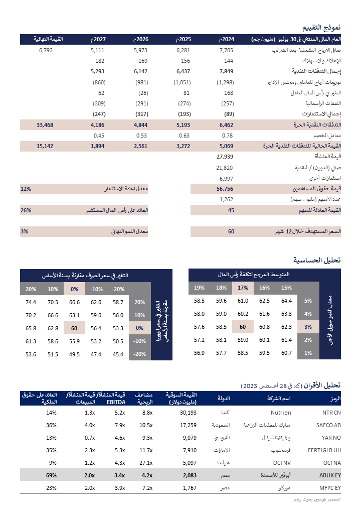 رفع السعر المستهدف إلى 60 جم/سهم، مع الاحتفاظ بتصنيف محايد / مخاطرة متوسطة: بعد مراجعة هذه الافتراضات وتضمينها في النموذج المالي للشركة، وباستخدام نموذج خصم التدفقات النقدية، مع افتراض متوسط مرجح لتكلفة رأس المال قدره 17% ومعدل نمو طويل الأجل بنسبة 3%، قمنا برفع السعر المستهدف خلال 12 شهر بنسبة 13% إلى 60 جم/سهم، مع الاحتفاظ بتصنيف محايد / مخاطرة متوسطة حيث أن احتمالية الصعود عن آخر سعر إغلاق هي 18%. نلاحظ أن تقييمنا يعتمد بشكل كبير على تكلفة الغاز الطبيعي وكذلك أسعار اليوريا وتغيرات سعر الصرف. ضمنياً، يعكس السعر المستهدف الجديد خلال 12 شهراً مضاعف ربحية ومضاعف قيمة المنشأة / EBITDA لعام 2024/2023 بواقع 6 مرات و2.8 مرة، على التوالي.