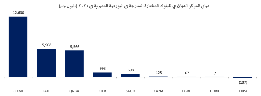 ستستفيد البنوك التي لديها صافي المراكز الدولارية إيجابية استفادة قصوى من التخفيض الأخير في الجنيه المصري. يتصدر قائمة المستفيدين البنك التجاري الدولي [COMI] يليه بنك فيصل الإسلامي [FAIT]. على صعيد آخر، كان صافي المركز الدولاري للبنك المصري لتنمية الصادرات سالباً في 2021 مما يشير إلى تأثير سلبي محتمل من انخفاض الجنيه المصري.
