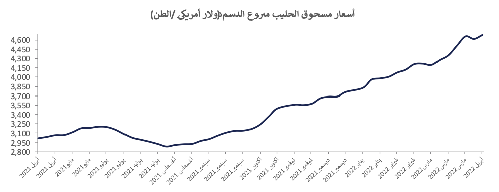 ارتفعت أسعار منتجات مسحوق الحليب منزوع الدسم بمقدار 55% هذا العام حتى الآن، لتصل إلى 4,676 دولار أمريكي/الطن.