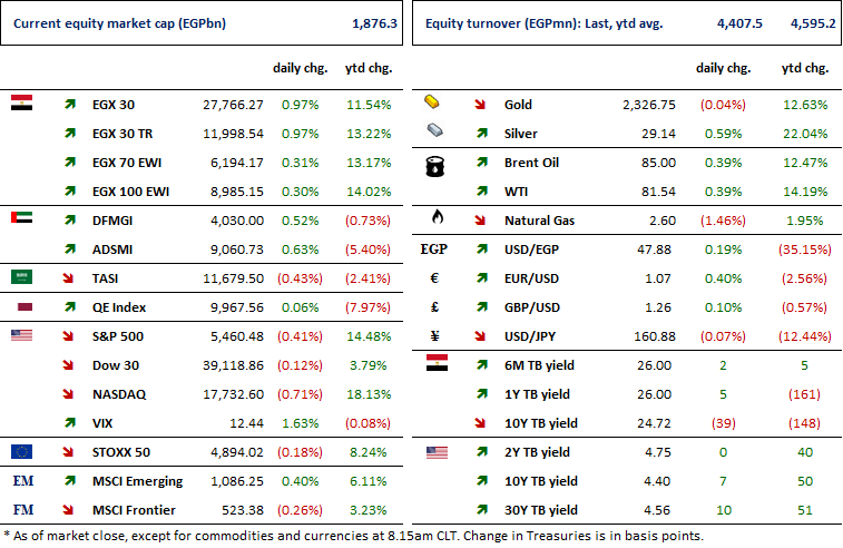 Abu Qir Fertilizers & Chemical Industries [ABUK] BoD’s approved 2024/25 financial budget, forecasting to record revenues of EGP18.7bn and earnings before taxes of EGP7.1bn. In addition, BoD approved starting the procedures for the partial replacement of the natural gas with hydrogen and the installation of new solar stations with a 2.5 MWP to reduce electricity consumption. (Company disclosure)
