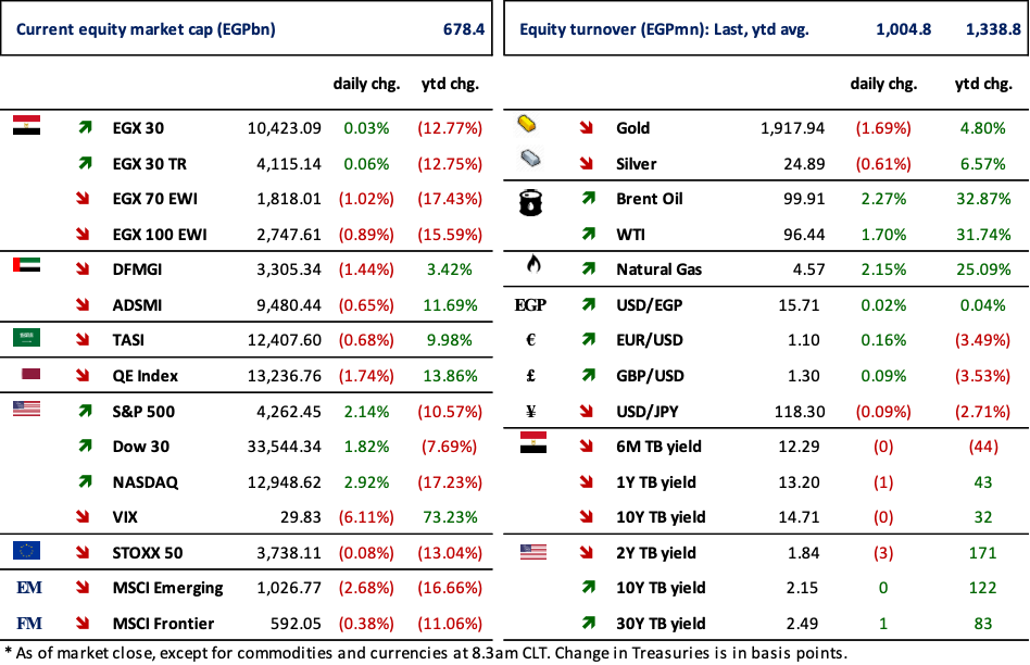 Elsewhere, caustic soda prices continued to be elevated, with prices crossing over the USD700/ton level. This promises great performance by chloralkali manufactures, as prices of both of the electrochemical unit components will favorably enrich margins. Caustic soda prices improved in light of higher electricity prices globally and exceptionally tight supply, especially after the situation between Ukraine and Russia. Here at home, Misr Chemical Industries [MICH] is a clear winner, with 7M 2021/22 earnings at EGP112mn (+20% y/y). We note that MICH is currently traded at 2021/22e P/E of only 5x. We also remind you that MICH is one of the 15 stocks we picked in our STANDPoint 2022 strategy outlook published on 30 January 2022. We have an Overweight rating on MICH, with a 12MPT of EGP13.9/share (ETR +45%).