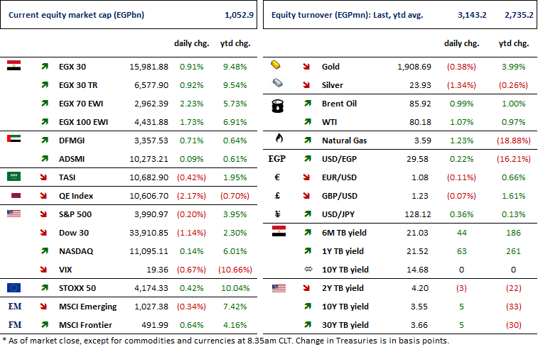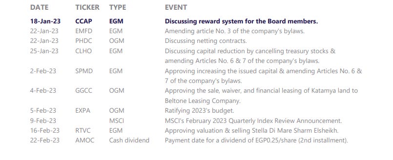 Sidi Kerir Petrochemicals’ (Sidpec) [SKPC] BoD approved 2023 budget, expecting net income of EGP890mn on revenues of EGP9.4bn. The 2022 budget had expected net income of EGP320mn on revenues of EGP5.2bn. The company’s 9M 2022 figures have already far eclipsed their full-year expectations, with a net income of EGP744mn on revenues of EGP5.8bn. Meanwhile, sources alleged that Sidpec intends to acquire ETHYDCO during Q3 2023. (Al-Borsa, Company disclosures: 1, 2, 3)