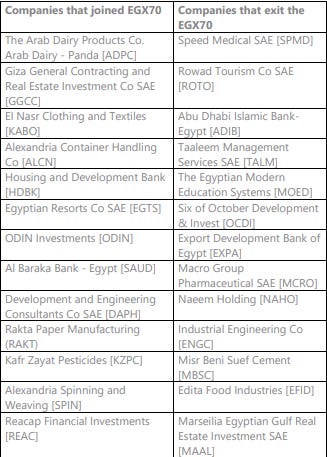 The EGX30 index semiannuall rebalancing has been done yesterday, with Alexandria Container and Cargo Handling Co. [ALCN], Housing and Development Bank [HDBK], and QNB AlAhli [QNBA] going out of the index and replaced by Edita Food Industries [EFID], Taaleem Management Services [TALM], and Abu Dhabi Islamic Bank [ADIB]. As for the EGX70 index, 13 companies were replaced. The rebalanced indices will be effective starting 1 February 2023 trading session. (EGX)