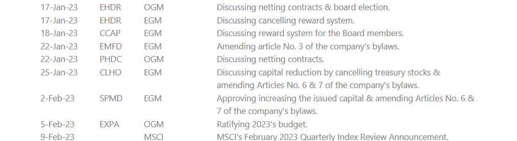 Having pulled liquidity out of the market and guided it away from dollarization, state-owned National Bank of Egypt (NBE) and Banque Misr (BM) are considering canceling their high-yield CDs (25% p.a. in 12 months and 22.5% p.a. monthly) within days. Proceeds from those CDs launched on 4 January 2023 reached some EGP300bn (NBE: EGP200bn, BM: EGP104bn). Meanwhile, Banque du Caire [BQDC] launched its own high-yield CDs with 25% p.a. in 12 months and 22.5% p.a. monthly. (Hapi Journal, Al-Borsa)