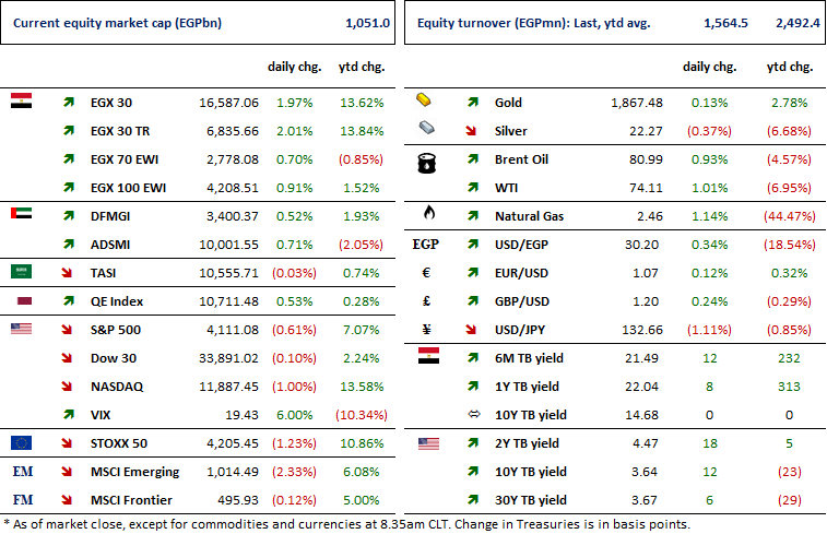 Egypt Gas [EGAS] 2022 preliminary results show net profits improving by 82% y/y to EGP301mn on revenues of EGP7bn (+30% y/y). The increase in bottom line came from a jump in investment income and other non-operating revenues, recording EGP544.9mn (+236% y/y) during the year. Meanwhile, GPM came at 5.3% (-0.7pp y/y). In other news, the BoD proposed a cash dividend of EGP1/share, implying a dividend yield of 2.9%. (Company Disclosure)