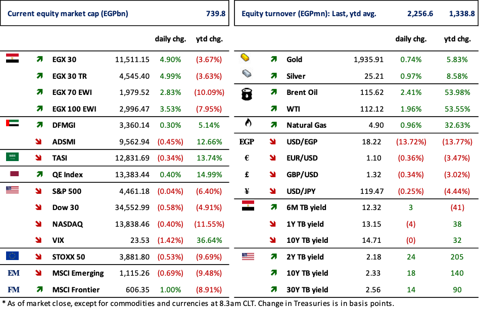 Yesterday, the EGX 30 leaped nearly 5%, achieving the biggest single-day gain since 22 March 2020—since almost two years. Trading volumes were notably robust, given the impactful EGP weakness on valuation levels for the entire market. Many investors may opt to see yesterday’s price action and the overall situation through the lenses of the 2016 flotation. However, we beg to differ. We believe comparing the recent 14% weakness in EGP to its full-blown devaluation in November 2016 overlooks obvious dissimilarities that we summarize below: