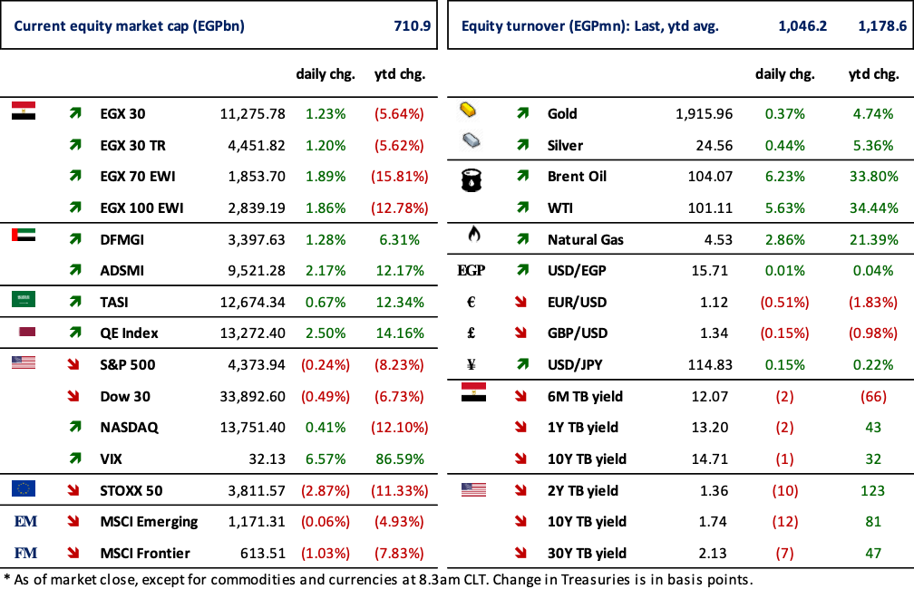Elsewhere, Housing & Development Bank [HDBK] reported its separate financials for 2021. The figures showed credit provisions flattening the bank’s net earnings of EGP1.83bn (+1.6% y/y). Growth in total banking revenues did not filter through the bottom line due to higher credit provisions as HDBK had reversed provisions in 2020 amounting to EGP179mn. However, the bank booked credit provisions of EGP162mn in 2021. Accordingly, cost of risk (CoR) inched up to 0.67% (+154bps y/y). While CoR upped y/y, asset quality weakened notably on an annual basis, with non-performing loans (NPLs) surging to 10.0% (+2pp y/y). Hence, NPL coverage declined below 100%, recording 83% vs. 121% a year earlier. In view of 2021 results, we raised our risk rating from Medium to High on concerning above-average NPL ratio. We note that HDBK’s BoD has proposed a DPS of EGP2.5/share, implying a 6% yield. That said, we maintain our 12MPT at EGP49.0/share (ETR +17%); hence, we maintain our Neutral rating. HDBK is currently traded at 2022e P/E and P/B of 3.0x and 0.6x, respectively.
