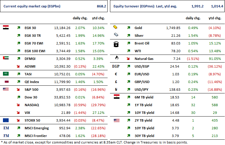 Meanwhile, MFPC's 9M 2022 net earnings grew to EGP5.0bn (+44% y/y) on higher top line of EGP12.3bn (+74% y/y). We note that export revenues contributed 66% to total revenues. MFPC is currently traded at TTM P/E of only 4.7x. Our 12MPT for MFPC is EGP180/share (ETR +37%). (Company disclosure)