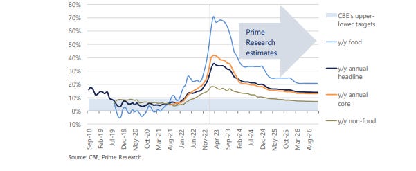 (2) Forecasted inflation to remain high: We expect “forecasted”, the CBE’s preferred benchmark as opposed to “prevailing”, inflation rates to remain at elevated levels. We now see inflation averaging 31.4% in 2023, peaking in March at 35.4% for headline and 41.7% for core readings.