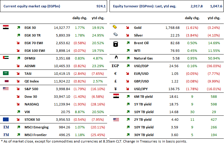 In this note, we revisit our assumptions and revise our financial model for Commercial International Bank [COMI]. This is in view of the latest developments in the banking sector, CBE policy decisions made since our last update, and COMI’s own record-breaking results seen in Q3 2022. Indeed, we had published a Core Coverage Update on 27 September 2022, affirming our positive outlook on COMI. Since then, our 12MPT of EGP41.1/share materialized, with COMI delivering a 69% return in two months’ time. Today, we see major catalysts and a higher potential for the name in the coming months. However, we downgrade our rating from OW/M to N/M, albeit with a 19% higher 12MPT of EGP49.1/share (+16% upside).