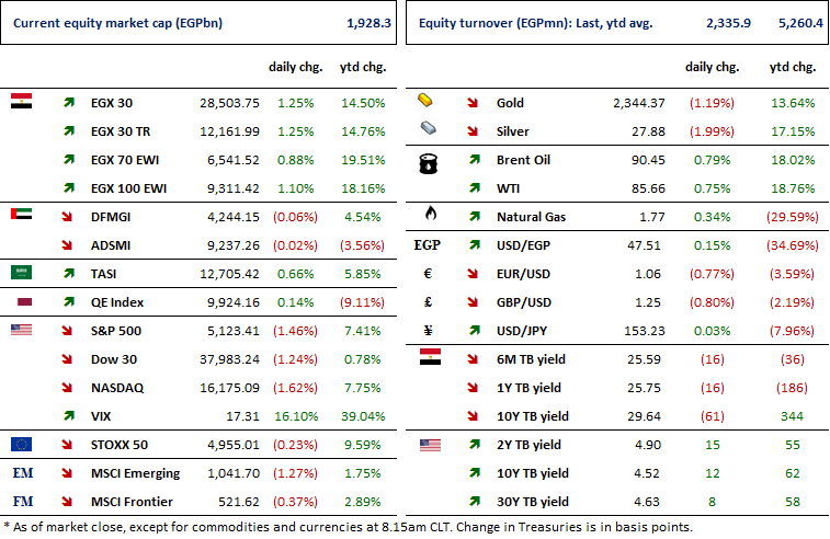 The government's revenues increased through 9M FY24 by 57% y/y to EGP1.5tn, while excluding the Ras El-Hekma deal it grew by 38% y/y. In addition, tax revenues grew by 41% y/y to more than EGP1tn, and the non-tax revenues grew by 123% y/y. Meanwhile, the budget deficit came flat at 5.4% of total GDP with the government expenditure growing by 51% y/y to EGP2.3tn. Regarding the primary surplus, it grew to 3% of the total GDP to EGP416bn vs. only EGP50bn last year. The Minister of Finance said that the government plans to decrease the debt servicing bills to 30% of the total government's spending. (Enterprise)