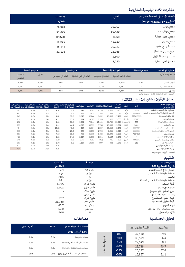 نلاحظ أن IRAX وESRS يتبعان بشكل فعال نفس المجموعة مع نفس الهيكل التنظيمي ونفس الإجراءات التشغيلية. وبالتالي، نحن ننظر فقط إلى الفائدة المضافة التي يمكن أن تحصل عليها ESRS من امتلاك 100% من IRAX لغرض هذا التقرير. نعتقد أن ESRS ستتمتع بقوة تفاوضية أقوى مع ارتفاع حصتها النسبية في السوق المحلية من تقديراتنا بنسبة 31% إلى 43% من إجمالي استهلاك الصلب في الربع الأول 2023 على أساس معايير مفترضة لـ ESRS وIRAX. نلاحظ أن حديد المصريين هو استثمار لدى IRAX وليس شركة تابعة تتحكم IRAX في عملياته. وبالتالي، اعتبرنا فقط القيمة المضافة لـحديد المصريين لأغراض التقييم. وحسبنا أن حصة حديد المصريين النسبية في السوق المساهمة لـ ESRS سترتفع من 3% إلى 4%.