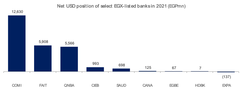 Banks with positive net USD positions will benefit the most from the EGP recent depreciation. CIB [COMI] is on top of the beneficiaries list followed by Faisal Islamic Bank of Egypt [FAIT]. On the other hand, Export Development Bank of Egypt's [EXPA] net USD position was negative in 2021, indicated a potential negative impact from the EGP depreciation.