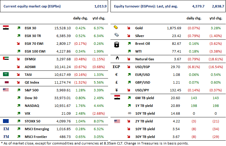 COMI introduced 22.5%/22%, annual/monthly EGP-denominated CDs. Although this piece of news was known the day before, investors (the story goes) thought such a move would negatively impact COMI’s profitability as investing the proceeds of that high-yield CD sale may prove difficult in the current market environment with treasuries yielding just 20%. We tend to think differently. First, the above view makes that dangerous “ceteris paribus” assumption (i.e. “all else being equal”). We think this will eventually manifest itself in higher Treasury yields down the road. That said, we think COMI’s decision is rather tactical (as opposed to strategic) in an attempt to safeguard its deposit base and market share, thus avoiding churn to National Bank of Egypt or Banque Misr. While such high-yield CDs will likely pressure COMI’s net interest margin (NIM), we think the effect on profitability will depend on how much of these CDs’ proceeds will represent out of the bank's total pool of deposits. We note that more than 50% of COMI's deposits are in low-cost current and savings accounts (CASA) which should give the bank some room to maneuver with such a high-cost product. Our banking analyst, Amany Shaaban, tried to gauge the impact on COMI’s 2023 net income (which we estimate at EGP19.2bn), assuming EGP10bn going into these high-yield CDs. If these deposits were new to COMI, then the impact would be EGP0.5bn or 2.5%. If these deposits were coming from within COMI, then the impact would be EGP1.2bn or 6%. Thus, noting that such CDs will only last for 1.5 years, one cannot build a long-term opinion on a short-term maneuver that is aimed at protecting the bank’s deposit base. Furthermore, since a stronger USD bodes well for COMI, we think its price weakness seen yesterday is not justified by any means.