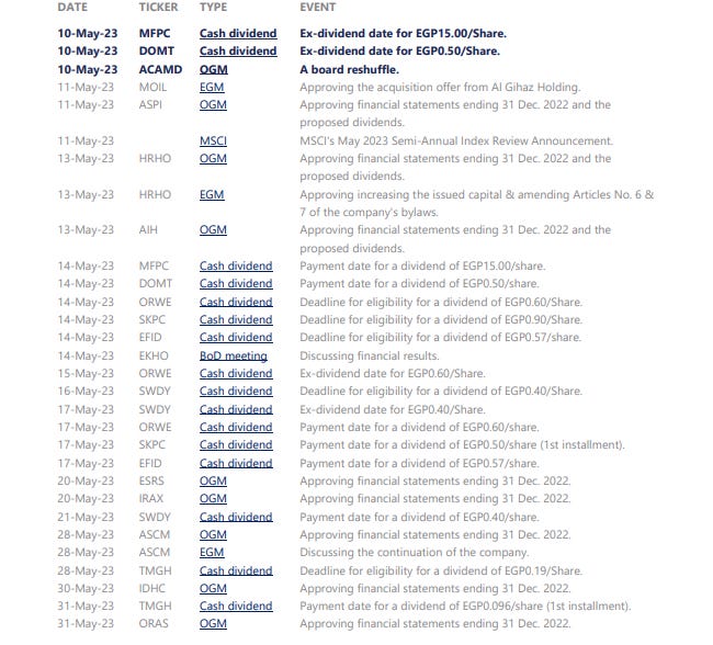 A sub-fund of UAE-based ADQ Holding is reportedly close to purchasing a 20-25% stake in the Egyptian Linear Alkylbenzene Co. (ELAB). We had reported on 3 April 2023 that discussions were underway regarding the sale of ELAB to GCC strategic investors and/or listing it on the EGX. If completed before end of May, ELAB will be the first major deal off the government’s IPO program. (Asharq Business)