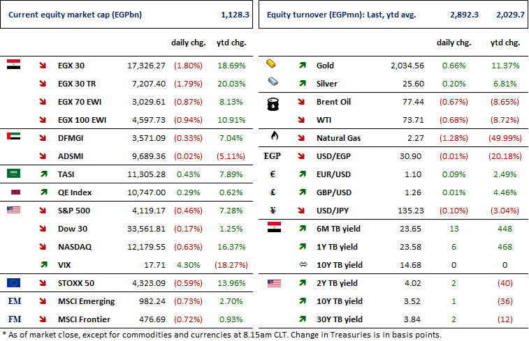 Urban CPI in April 2023 climbed 30.6% y/y (vs. +32.7% y/y the previous month). Urban CPI also rose 1.7% m/m (vs. +2.7% m/m in March), according to CAPMAS. Our forecasts for April's urban CPI was higher at 31.8% y/y. (Bloomberg)