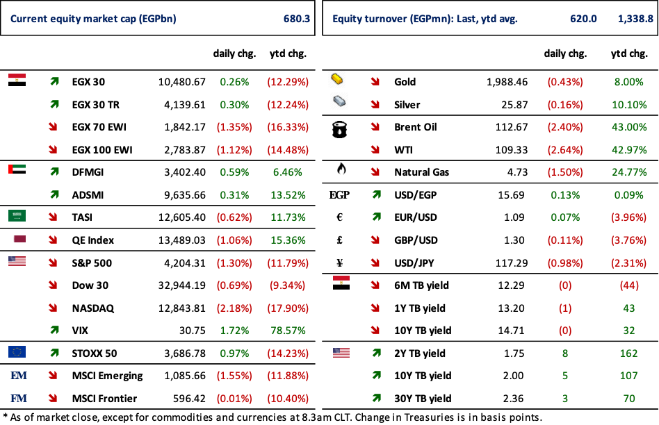 Raya Holding’s [RAYA] net earnings after minority EGP487mn in 2021 vs. EGP62mn in net losses. Turning to profitability was sponsored by 57% higher revenues to EGP16.8bn. We note that RAYA’s consolidated financials saw income arising from deconsolidation of EGP327mn in 2021. RAYA is currently traded at 2021 P/E of 9x, with ROAE of 36%. Furthermore, RAYA’s subsidiary Aman Holding will be establishing a JV with TAQA Arabia, a subsidiary of Qalaa Holdings [CCAP], to digitize Egypt’s energy sector. The paid capital for the new JV will be EGP20mn, with Aman Holding stake at 51%, whereas TAQA Arabia’s stake at 49% (Company disclosure)